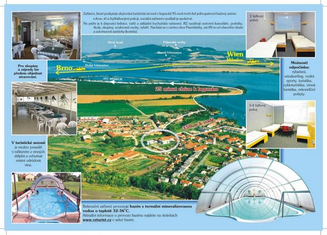 "Pasohlávky, U Kostela". Od kostela je 100 m k zařízení. Směrové tabule Ubytování TURIST.