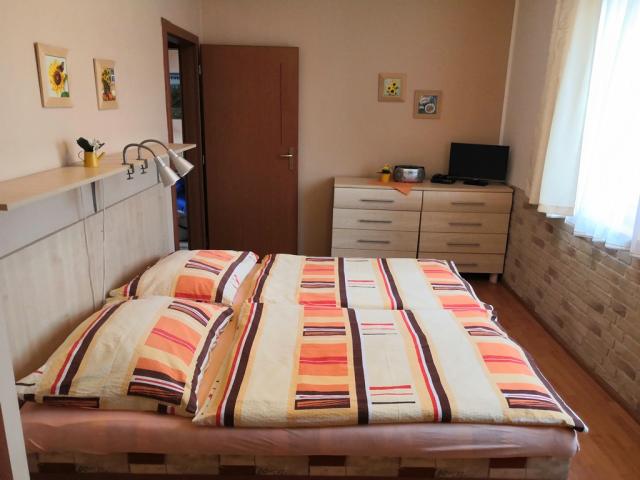 - 1x dvoulůžkový pokoj s manželskou postelý, 1x dvoulůžkový pokoj s rozdělenými lůžkami, sociální zařízení s WC a sprchovacím koutem, chodba se šatníkovou skříní
