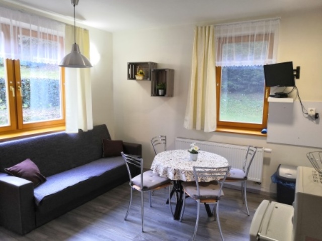 - každý apartmán má koupelnu a WC, kuchyňský kout (plynový sporák, trouba, lednice, stůl), TV + SAT, krbová pec