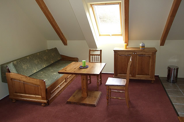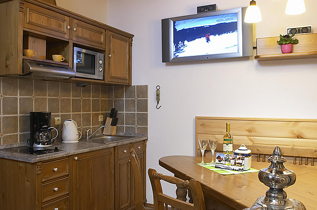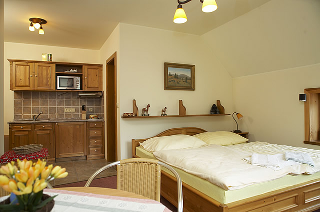 V každém ze čtyř moderně zařízených apartmánů je obývací místnost s plně vybaveným kuchyňským koutem, jídelním stolem, americkými krbovými kamny, rozkládací sedací soupravou, plazmovou televizí, DVD a SAT sestavou, dále ložnice s manželskou postelí a dvěma lůžky a sociální zařízení.