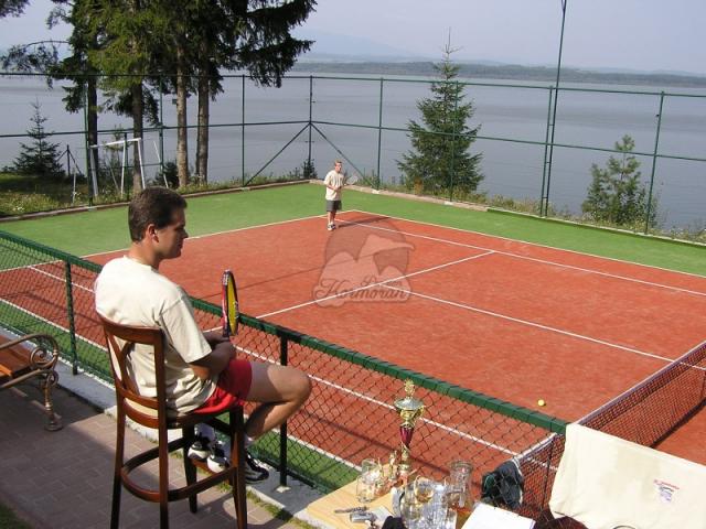 Lákadlem je i posezení na terase, kde je výhled na tenisový kurt, Slanický ostrov umění a vodní hladinu.