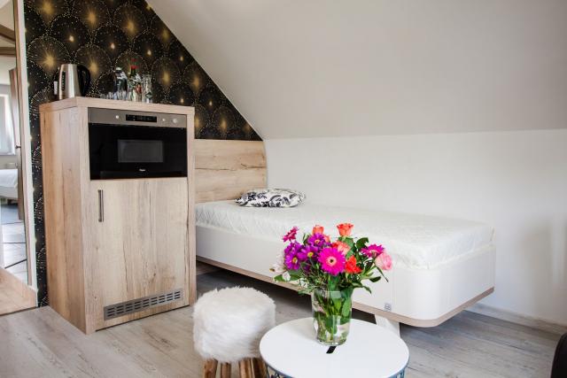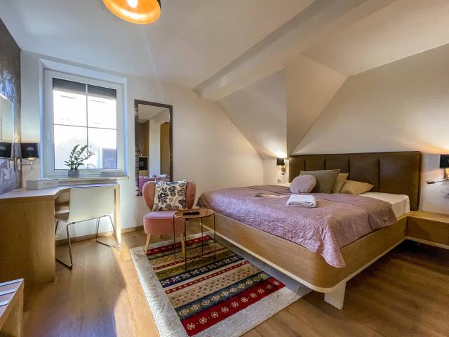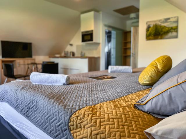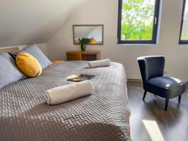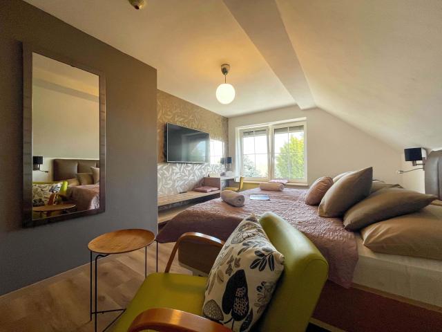 velkou luxusní designovou postelí a zdravotní matrací. Podkrovní rodinné pokoje s kuchyňským zázemím pro přípravu čaje, kávy, chlazení a ohřev menších jídel. Přízemní čtyřlůžkový pokoj s oddělenou ložnicí s prostornou terasou a vlastním téměř stometrovým místem v zahradě. Ideální pro rodiny s dětmi, ale i páry, které si svoji dovolenou chtějí opravdu užít.