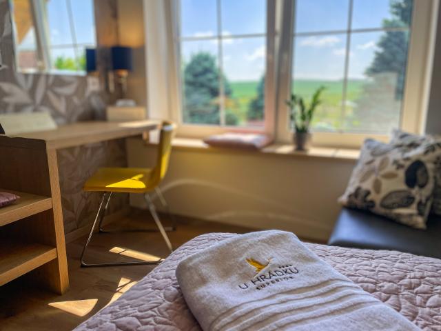 Náš nejstarší dům. V roce 2020 rekonstruované útulné pokoje s výhledem do zahrady nebo na nekonečná úrodná pole. Zemité barvy prolínající se s bílou výmalbou a odstíny dřeva ... a opravdu pohodlné postele.