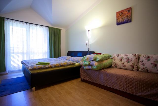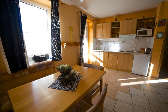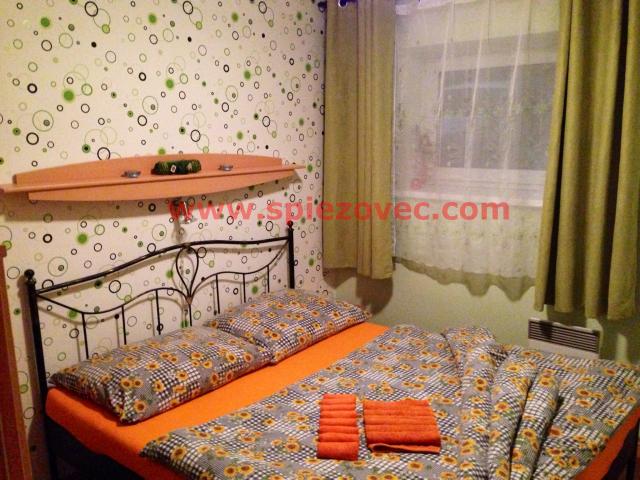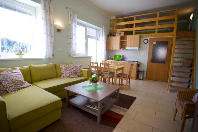 -> na 4.poschodí apartmánového domu o rozlohe 62 m2 má 1 spálňu s manželskou posteľou a dve jednolôžka, na poschodí ma druhú spálňu s dvomi posteľami pre 2 - 4 osoby a obývaciu izbu s kuchynským kútom. V obývacej izbe je rohová sedacia súprava, LCD TV, na požiadanie poskytneme DVD prehrávač . Kuchynský kút je vybavený dvojplatničkou, mikrovlnnou rúrou, varnou kanvicou, chladničkou a riadom.V chodbe je samostatné WC a kúpeľňa s vaňou. Apartmán má balkón s výhľadom na les o ploche 5 m2.