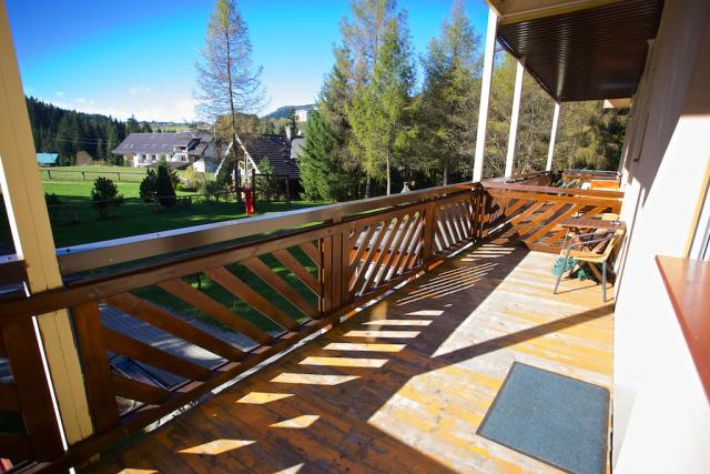 -> sa nachádza na 1. poschodí. Má spálňu s manželskou posteľou a jednolôžkom, obývaciu izbu s rohovou sedacou sedačkou, plne zariadený kuchynský kút, samostatné WC , kúpeľňu s vaňou. Nad kuchyňou sa nachádza mezonet na spanie pre 2 osoby. Apartmán má veľkú terasu s prekrásnym výhľadom na Donovaly. Veľká slnečná Terasa je orientovaná na juhozápad .Plocha bytu 42 m2, plocha slnečnej terasy je 15 m2.Kuchynský kút je vybavený štvorplatničkou, mikrovlnnou rúrou, varnou kanvicou, chladničkou a riadom,wifi free na apartmane.