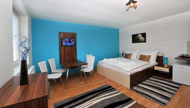 Štúdia s kuchynským kútom (veľkosť obytnej plochy 25 – 30 m² ). Ubytovanie v štúdiu vhodné pre max. 4 osoby. Štúdio pozostáva z predsiene, kúpeľne so sprchovacím kútom a WC a jednej miestnosti s 2 lôžkami s pohovkou, konferenčným