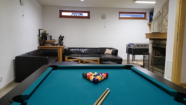 - společenská místnost s otevřeným krbem, rádiem, TV, kulečníkem, stolním fotbalkem, stolním tenisem, šachmi a šipkami