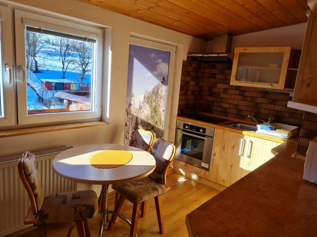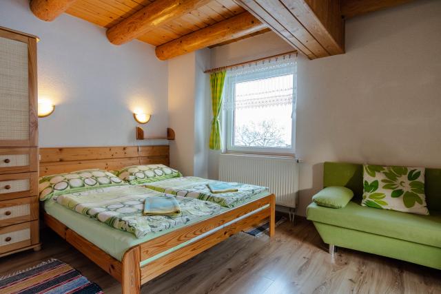 Pokoje se samostatným vchodem ideální pro skupiny rodin ve složení 3×2-lůžkový a 2 x 3 lůžkový, mají vlastní společenskou místnost a zařízenou kuchyň, /2x chladnička, mikrovlnka, rych. konvice, plynový sporák s troubou, jídelní servis/.