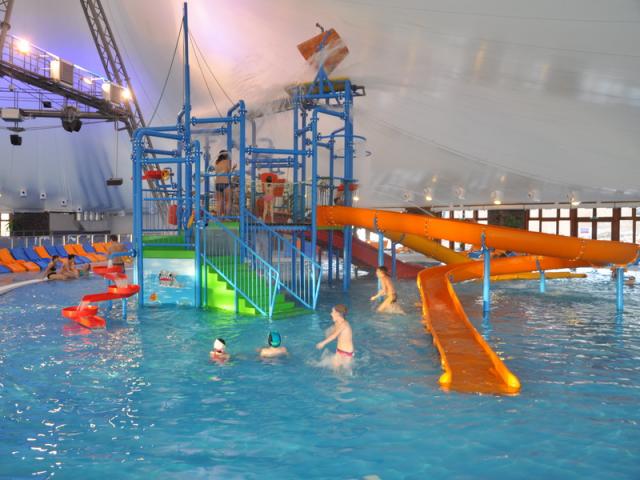 * sedací bazén s různými atrakcemi (whirlpool apod.), velký plavecký bazén s nerezovým tobogánem, dětský bazén se skluzavkou, vodním hříbem či ježkem