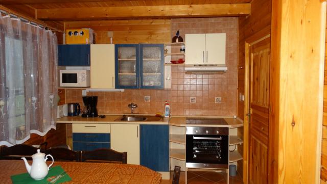 2) plně vybavená kuchyň s jídelnou - varná deska, 2 x lednička, varná konvice, mikrovlnná trouba, vestavná trouba, nádobí pro dvanáct osob, mrazák.