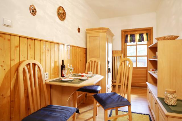 Doplnkové vybavenie pre hostí: detská drevená postieľka, spoločná kompletne zariadená kuchynka (mikrovlnná rúra, dvojplatnička, chladnička s mrazničkou, práčka, taniere, poháre a príbory)