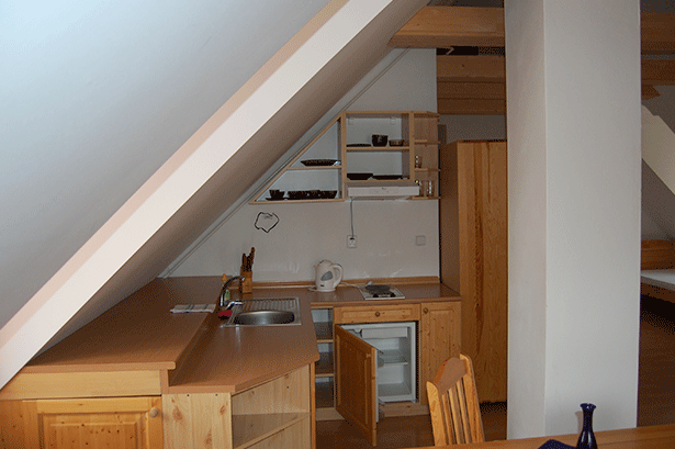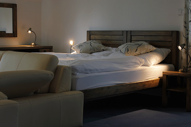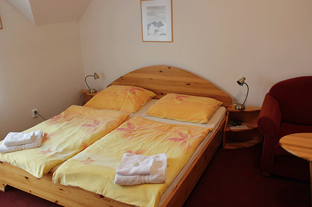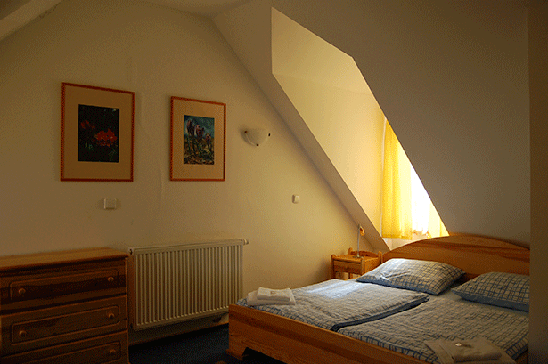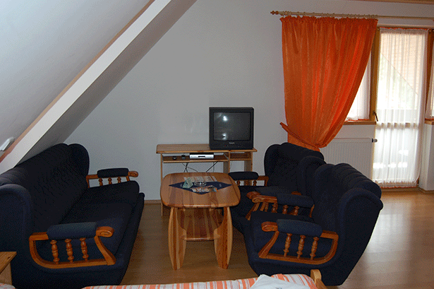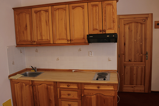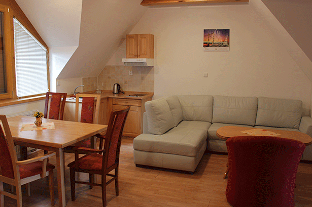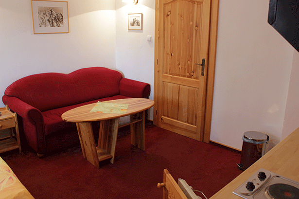 Izba s kúpeľnou, WC, TV, gaučom, s vlastnou kuchynkou a s vybavením. Do izby je možné umiestniť detskú postieľku.