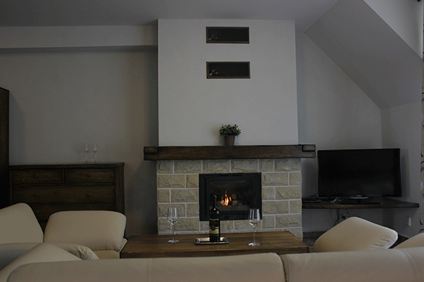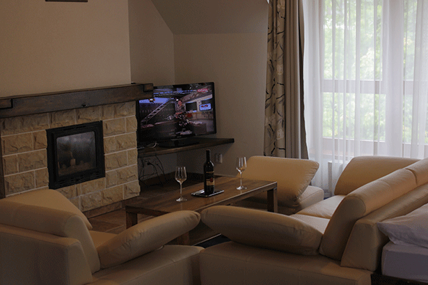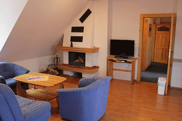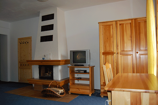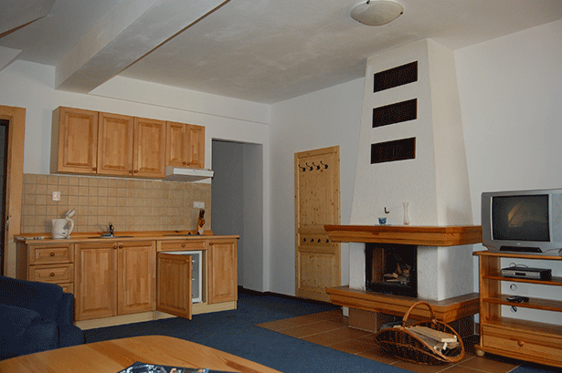 Priestranný apartmán s možnosťou 1-2 prístielok, s obývacím priestorom, krbom, vybaveným kuchynským kútom, sociálnym zariadením (sprcha alebo vaňa, toaleta) a TV.