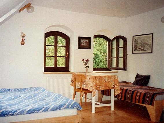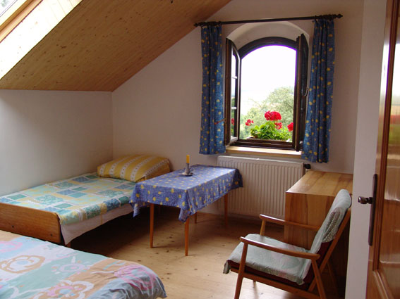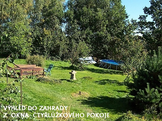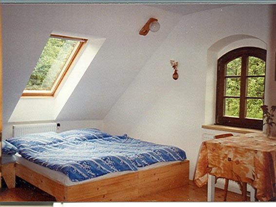 Prostorný pokoj v podkroví penzionu s pěkným výhledem do zahrady. Koupelna se sprchou a WC. Rádio, televize, WIFI. Přímo na pokoji je lednice s mrazící schránkou, varná konvice a základní nádobí pro stolování. K vaření je možno využít kuchyňku v přízemní hale – dvouplotýnkový vařič, mikrovlnka, remoska, dřez, dostatek nádobí pro vaření a stolování. Za pěkného počasí je možno stolovat venku u stolu hned za dveřmi haly.