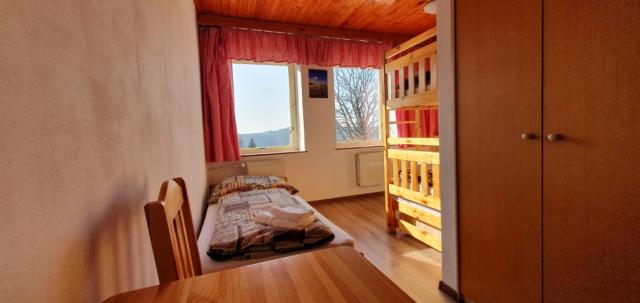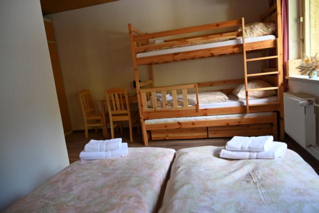 Pokoj je vybaven dřevěnou palandou s plnohodnotnými lůžky z borovicového masívu a manželskou postelí. Druhá přistýlka je řešena vysouvacím lůžkem pod palandou. Dále je zde šatní skříň, stůl, židle, noční stolek a lampička. Samostatné WC a koupelna s malou vanou v retro stylu.Pokoj orientovaný na sever s výhledem do lesa oceníte v horkých letních dnech.