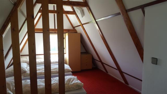 V podkroví je pak umístěna ložnice se čtyřmi lůžky. Postele jsou povlečené a hosté mají k dispozici ručníky.
