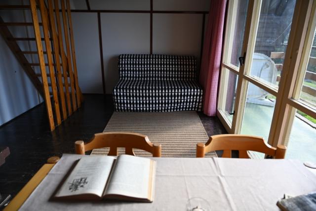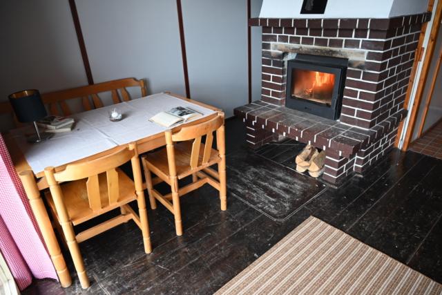 V přízemí je společenská místnost s rozkládacím gaučem (přistýlka pro 2), jídelním stolem, krbem a kuchyňkou.