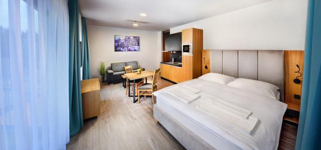 Apartmán pre 2-4 osoby je ideálny pre skupiny či rodiny o veľkosti do 4 osôb. Apartmán v rámci svojej rozlohy do 39 m2 ponúka spálňu s manželskou posteľou alebo dvoma oddelenými lôžkami a obývaciu časť, v ktorej gauč slúži po rozložení aj ako plnohodnotné spanie pre dve dospelé osoby. Súčasťou apartmánu je plne vybavený kuchynský kút a komfortne zariadená kúpeľňa s toaletou a sprchovým kútom