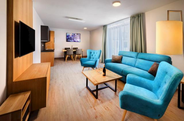 Rodinný apartmán Lux poskytuje naozaj mnoho priestoru, preto je skvelou voľbou pre rodiny a všetkých, ktorí ocenia jeho vzdušnosť, priestrannosť a skvelé výhľady. Rozloha apartmánu je do 55 m2 a poskytuje jednu oddelenú spálňu s manželskou posteľou. V apartmáne sa nachádza aj umývačka riadu. Obývacia časť ponúka gauč, ktorý po rozložení slúži ako plnohodnotné spanie pre dve dospelé osoby, TV, jedálenské posedenie a plne vybavený kuchynský kút. Niektoré apartmány naviac disponujú rozkladacou taburetkou, ktorá vytvorí lôžko pre jednu osobu. Súčasťou apartmánu je komfortne zariadená kúpeľňa s toaletou a sprchovým kútom.