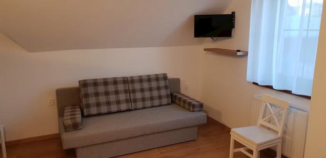 1x Ložnice (podkroví): 1x manželská postel, 2x přistýlka (gauč)
