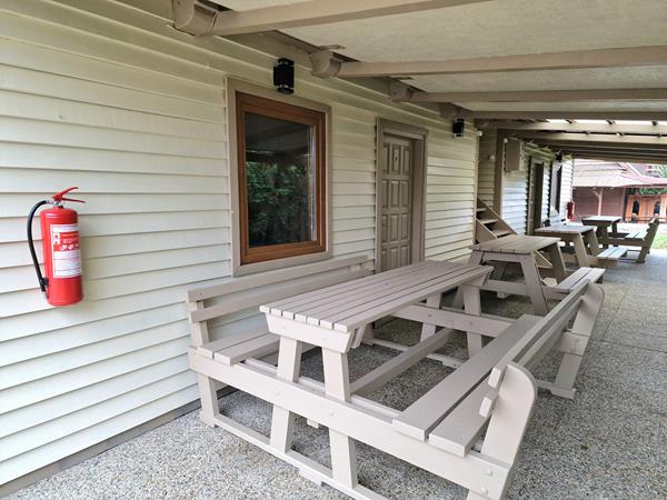 Vo vonkajšej časti chaty si na terase môžete príjemne oddýchnuť alebo zahrať s deťmi či priateľmi nejakú zábavnú spoločenskú hru. V roku 2024 bola rekonštrukcia aj vonkajšej časti, pribudla nová hojdačka, nové posedenie a nový betonový grill.